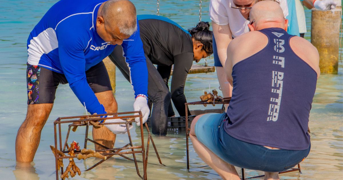 As part of its ongoing sustainability efforts, Cinnamon Dhonveli Maldives has taken proactive steps to support reef regeneration through a structured coral restoration programme. The initiative recently included the installation of 25 coral frames, each carefully planted with coral fragments collected from naturally broken corals found within the surrounding lagoon and reef areas.
