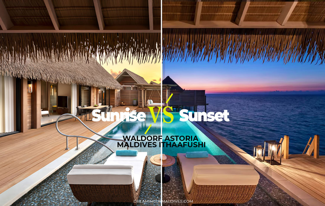 Here are the awesome views you will enjoy at Sunrise and at Sunset if you stay in a water pool villa at Waldorf Astoria Maldives Ithaafushi.
